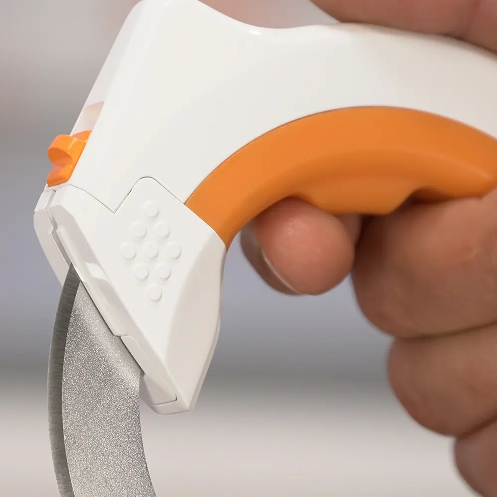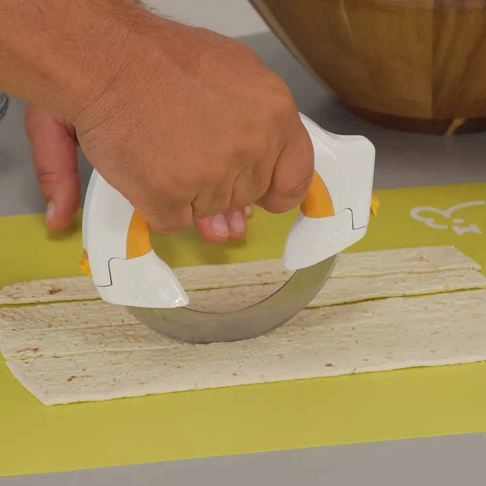 Fabricado en acero inoxidable forjado, este cuchillo mantiene su filo por más tiempo gracias a su diseño circular, que asegura un contacto constante y suave con los alimentos. Además, su estructura ergonómica mantiene tu mano alejada del filo, brindando una experiencia mucho más segura y evitando que se desafile fácilmente.