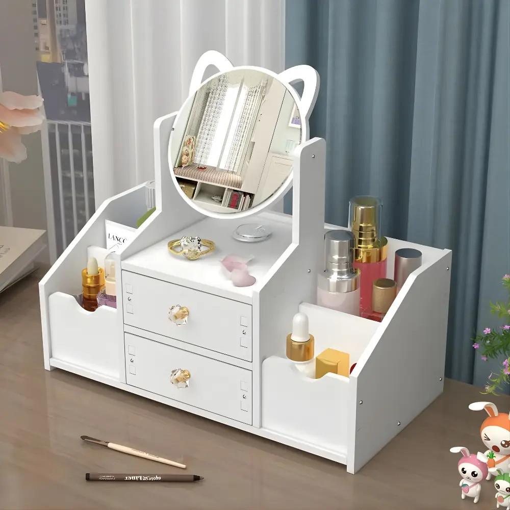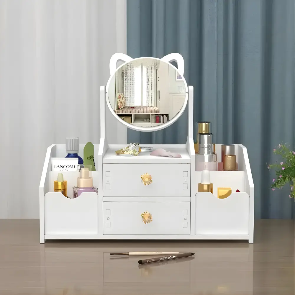 El Organizador de Maquillaje con su encantador diseño en forma de gato y espejo incorporado, es la solución perfecta para mantener tus cosméticos y accesorios organizados de manera elegante. diseño funcional y atractivo.