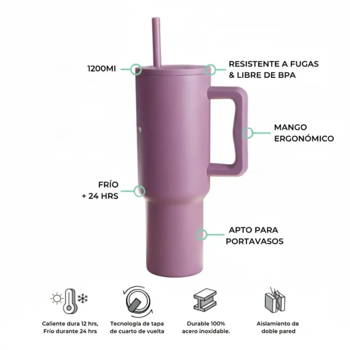 Este vaso con asa de 1200 ml. es el compañero de hidratación perfecto que mantiene su bebida fría durante más de 24 horas y tu bebida caliente durante mas de 12 horas debido a su aislamiento de doble pared, tambien tiene una tapa resistente a fugas.